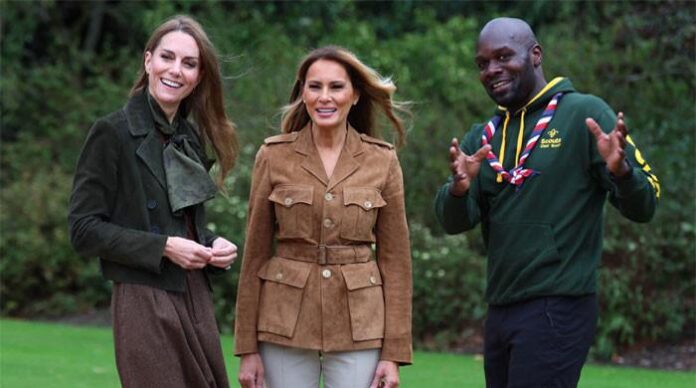 Kate Middleton says, “Introducing First Lady Melania Trump to Chief Scout Dwayne Fields and a group of young Scouts from the Squirrels programme at Windsor today.
